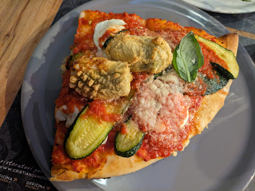 La Zuccosa ( Pizza ) - containing Tomato, courgette parmigiana, stracchino and battered courgette flower ( shown in a separate photo attached, that gives a close up view ) stuffed with mozzarella and ricotta.
