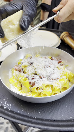 We came with a reservation for a table for 7 people. No one acknowledged us for more than 5 minutes while we were standing at the entrance of the restaurant. In the meantime, two people got up after having finished their meal and went up to the counter to pay. The staff counted up their order and took the payment, while we were still unacknowledged and waiting at the entrance. After 10 minutes we were finally seated. The menu is quite poor, very few options, no secondi dishes - only starters and a couple of pastas. After we had chosen our dishes, the waitress saw us waiting and ready to order, and told us she was coming to us soon. She told us that twice more before actually coming to take our order. We ordered our food, they ran out of the single wine they have by the glass (Syrah) and offered us Primitivo instead, to which we agreed. While taking the order, the waitress was not friendly or welcoming at all, she seemed annoyed when one of us ordered a small (light) version of the fresh pasta, and was advising to get at least a medium one, but we stayed with our choice. Then they brought the wine, and poured into our glasses to taste it first. The movements of the waitress were brisk, and some wine spilled into my friend's glass of water, which the waitress took no notice of. The pasta arrived, and all the carbonaras we had were super salty, and the pancetta was overfried. Probably the worst pasta I've ever had. None of us enjoyed their dish. Completely unacceptable for this price. Additionally, they added a €24 service charge. For the service we did not enjoy at all.