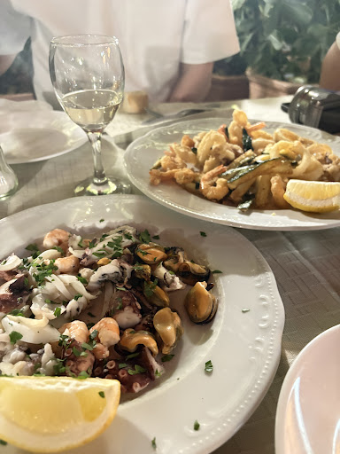 allora sono andata perchè le recensioni erano abbastaza buone ma devo dire....... ci hanno fatto mettere in dei tavoli dove ci stava una mosca morta e nei tavoli attorno la maggior parte erano tutti sporchi da chi ci ha mangiato prima, ma passiamo oltre. io ho preso una grigliata mista di pesce... è arrivato un piatto con 4 cose in croce, non aveva un buon sapore perchè l'unico sapore che sentivo era il bruciato. il mio ragazzo ha preso spaghetti alle cozze, non era un gran chè sia la pasta che il pesce. abbiamo mangiato di fretta per scappare il prima possibile. comunque 13 euro per una grigliata del genere anche no. hanno portato il cestino del pane con 4 pezzetti credo che non ci...