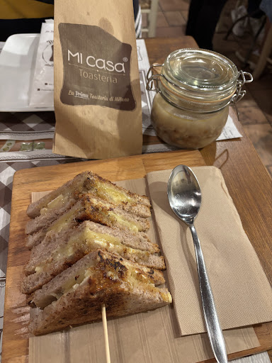 Relaxed place with great value and very friendly service. The motto on the wall is “Mi Casa is Family, and Family is Sharing” We shared a bowl of the Vegetale soup shown in the translated photograph as ‘Legume soup’; with potatoes, lentils, cannellini beans, borlotti beans, chickpeas, barley, spelt, onion, courgette with extra-virgin olive oil, tomato purée, and salt and pepper. and a grilled cheese sandwich- The DELICATO with Fontina DOP, melted brie, parmesan flakes, honey and ground black pepper, on the daily bread which was Almond. It was served in triangles speared on skewer. Perfect balance of flavours. All 8 soups are vegan, at €9, served with dry bread croutons in a paper bag, or gluten free bread for an extra Euro. The patio is busy in warmer weather, particularly at cocktail hour; and it is popular with local families. I’ve added screen shots of translated menu pages, but they aren’t complete as I only included pics of items that are vegetarian so that we could order dinner. With only €1.50 cover it is a reasonable place for a snack or light meal especially for vegans and vegetarians. The big salads are €10.50, whereas most other places charge 13-14. Next door is Turro Panini and across is Il Fornaio, so it is a dining hub of the...