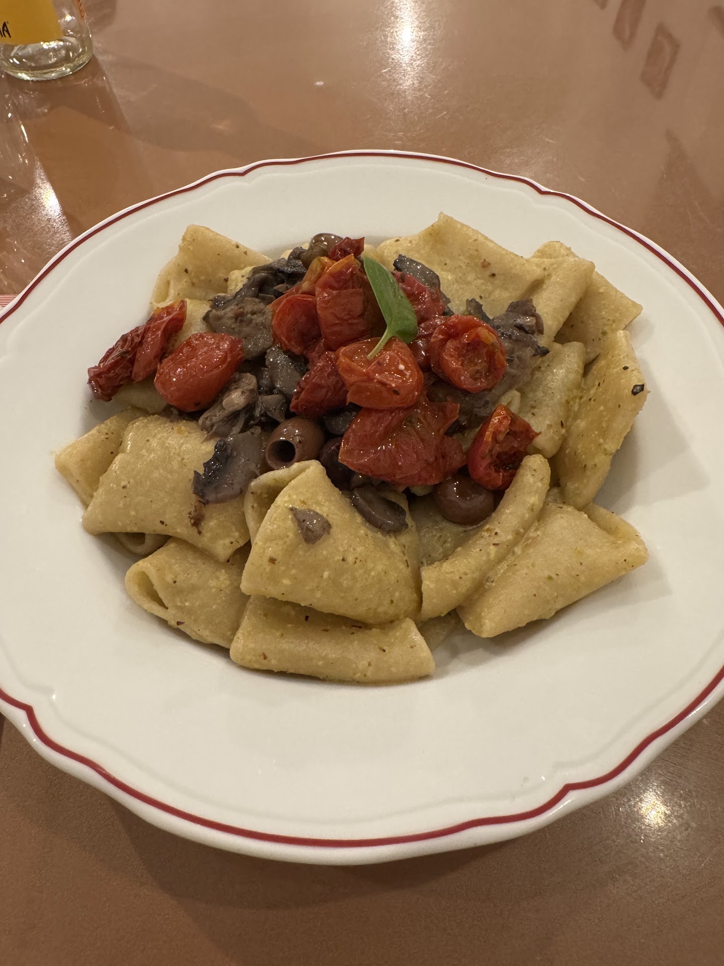 I opted for a vegan pasta dish, customizing it with a few toppings. The food itself was decent, but it lacked the depth of flavor I was hoping for. While the mushrooms were plentiful and well-cooked, other toppings, like olives and tomatoes, were meager, especially given their steep price—€4 for what amounted to a spoonful. The portion size of the pasta was adequate, but the overall dish felt uninspired and not worth the extra cost.