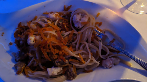 Didn’t set out for anything special but saw a nearby seafood place called Montecristo on Trip advisor with good ratings so strolled in there. Turned out to be a Sicilian seafood restaurant with over the top décor and service. Décor reminded me of the Grotta Capri in Kingsford (Sydney) in 1960. Lots of coloured lights, a fabulous display of fish decorated with fruit. Big ones like half a swordfish and little ones and various crustacea. The patriarch comes to the table to greet you but the adult son is the maitre d’, and the matriarch supervises a kitchen of Asian chefs who come in wearing red hats and select fish from the display as they're ordered. Main courses look expensive but the campari aperitif is free and the breads and grissini of course. Sicilian waiters who will discuss the enormous menu. I had a wonderful seafood soup with crostini that was so fresh and fragrant, and the waiter misunderstood me and thought I ordered also a seafood risotto and a dish of John Dory (San Pietro) with apples. After the risotto I said I couldn’t fit in the John Dory, but no problem. I can change my mind any time. A vast wine list but nothing by the glass listed. When I asked if they sold wine by the glass- no problem. He brought half a bottle of Veneto sauvignon blanc (much less grassy than ours.) Then came a dish of mixed grilled vegetables on a plate decorated by lemons flaming with some solid fuel. The waiter expressed considerable disappointment that I could only eat half. After a break I agreed under some urging to a sorbet of oranges with Campari-wonderful. Came with a tray of amaretti biscuits. I declined coffee but the waiter wanted me to try a liqueur as a digestif- he brought Mirto di Sardegna –a myrtle-derived liqueur. A bit odd at first but grew on me.