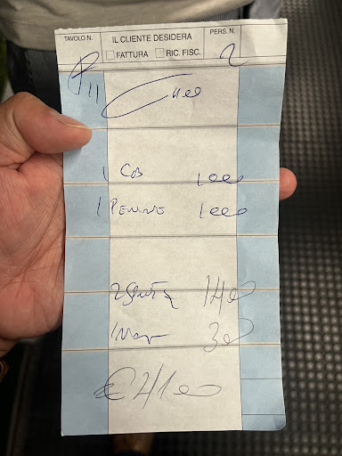 Fast forward, we ordered 2 pasta meal (cost âŹ10 each), 2 aperol spritz (cost âŹ7 each), and a bottle of water (cost âŹ3).