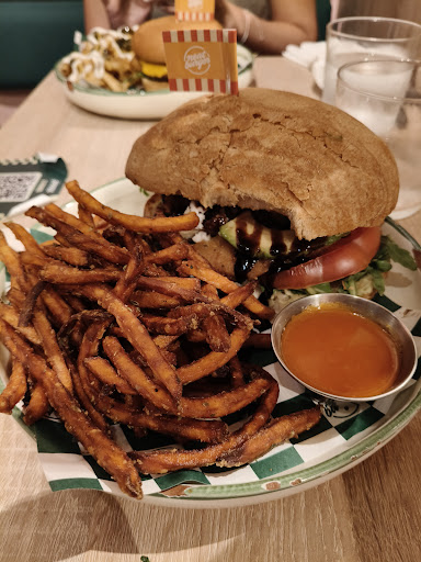 Read moreFamosa catena di Hamilton e Di Caprio con menù 100% Plant Based, ero assolutamente curioso di provarlo. Il locale è molto eccentrico e ben curato, con questa combo di rosa e verde che rendono tutto così "esotico", e poi il pulsante di attesa in bagno che fa partire una sorta di mini discoteca; l'americanata fatta bene che probabilmente serviva perché da quel tocco di eccentricità in più. Comunque, personale super gentile che si assicura che tu conosca il format prima di farti accomodare (non sia mai che qualche carnivoro ci rimanga male forse). Il menù comprende antipasti, hamburger, panini, hot dog e dolci; c'è anche qualche piatto della tradizione, tipo la parmigiana, che però ammetto di aver voluto provare, non ero ancora pronto. Ma partiamo dagli antipasti: mozzarelle sticks e finti nuggets di pollo. Le prime direi proprio di no, molto molto unte e non c'è per nulla il senso di filante che ti aspetteresti (non chiamatele mozzarella stick secondo me). I nuggets invece sono TANTA TANTA ROBA, davvero incredibili, sono rimasto a bocca aperta. Credo che siano anche molto meglio di quelli di pollo originali. Come panino, ho optato per il classico Smash burger con doppia "carne", accompagnato da patate dolci. Il Ban è alle patate, davvero ottimo, e il panino in se si presenta bene, forse però me lo aspettavo più grande. Il gusto è quello di tipico panino da fast food, buono per davvero, e la salsa all'interno è spaziale. Anche le patatine dolci sono ben fatte, croccanti e non unte. Conto finale per tutto questo e un'acqua 25€, direi promosso a pieni voti. Ci tornerò sicuramente perché devo provare qualche dolce; inoltre hanno il panino con una mega cotoletta di pollo che, se ha lo stesso gusto dei nuggets, è davvero la svolta....