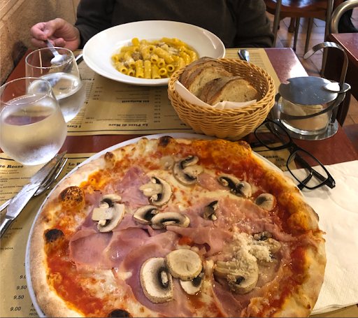 After a long day of walking around, we checked out Nico's right when they opened for lunch. We beat the crowd as it filled up pretty quickly. Since it was my first Milan pizza, I tried their pizza with ham, mushroom, and cheese. I was pleasantly surprised at the large size and low cost of this pizza. It was a nice, hand-tossed pizza with a chewy crust and lots of cheese. The only reason, this review didn't garner five stars is that the crust on the bottom was a little too thin which made it drippy when trying to pick up a slice. My wife had a bowl of pasta but unfortunately it wasn't cooked long enough. We do like our pasta al dente, but this still needed a couple more minutes. The pizza and the past came out right away and the flavors were outstanding. Overall, the service and atmosphere was excellent. Great sauce flavor on the pasta. And the bill with a bottle of mineral water was about 22 euros. I would have gone back if I had the chance. 9.50 Euros for the...