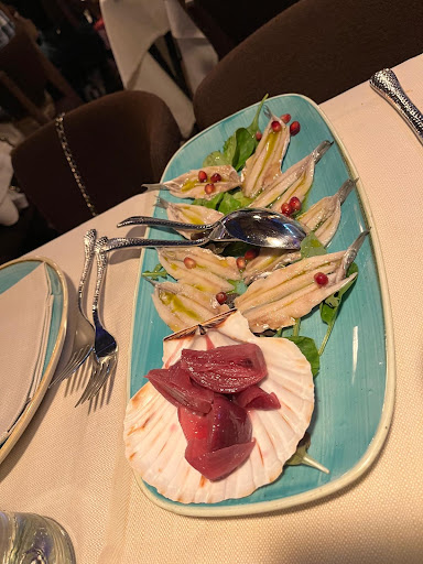 Infine, il gambero viola che abbiamo preso, che doveva venire da Gallipoli, sapeva d’acqua e non aveva alcun sapore. I ricci erano ottimi, ma la temperatura degli scampi non era accettabile: erano serviti a circa 4°, senza nemmeno un po’ di ghiaccio sopra per mantenerli freschi. Abbiamo scelto questo ristorante perché ci avevano detto che era molto rinomato, ma a quanto pare nel tempo è cambiato, e in peggio. Tutto lo staff, tranne il caposala e il cassiere, sembrava essere composto da ragazzi di origine probabilmente bengalese o pakistana, che però venivano trattati con molta sufficienza, quasi come se non fossero degni di rispetto.