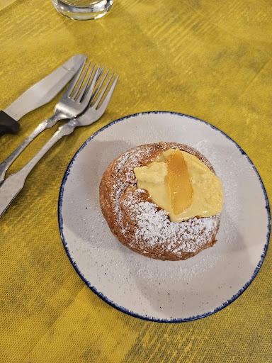 Per concludere questa straordinaria esperienza gastronomica, ci siamo deliziati con i dolci, in particolare con la calda e fragrante frittella con mele accompagnata dalla cremosa crema pasticcera, un autentico piacere per il palato. Nel complesso, l'esperienza è stata assolutamente positiva, sebbene si debba notare che il dehor esterno presenta diversi spifferi e, nonostante le lampade riscaldanti, si avverte il freddo. Non vediamo l'ora di tornare e rivivere questa deliziosa avventura culinaria...