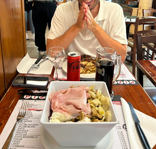 Read moreGoogle says it opens at 6pm but it does not open until 7pm. So we waited and thank god we did🙌🏼. The menu is on the walls you can pick whatever ingredients you want on your pizza and or pick a pre-made one. We tried the “Romagna“ and the lasagna. The pizza was the best I’ve had in Milan. I HIGHLY HIGHLY recommend it. The pictures do not do it justice. The lasagna tasted like it had 10 cheeses it was delicious. We also got the half bottle of house wine and it was a great choice it almost tasted like red wine and coke (which i loved). To finish it off we had the Tiramisu and it was good! It was also super popular with the locals, while we were waiting for our food we saw about 5-6 locals come pick up pizzas to take home and come by to say hi to the staff. I truly was amazed by the amazing taste of their food if you have time to grab a slice you will...