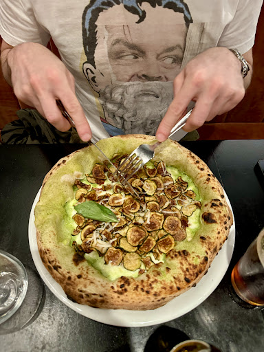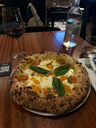 About the food and atmosphere: amazing I wanted to have a Sicilian wine but it was unavailable that day so I had a recommendation from the waiter about another option and it was good! The pizza tastes awesome! Incredible due to its simple ingredients. The music is good, not so loud, so you can hear people with whom you came.