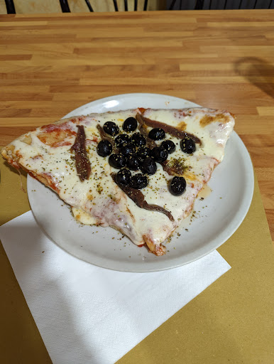 La farò breve: ero entrato per mangiare rapidamente una pizza, ma ciò che mi è stato servito non è stato degno di tale nome. Per prima cosa, qui servono una pizza che non è tonda, bensì sotto forma di fetta (cosa, peraltro, non specificata nel menù), quindi il primo impatto negativo è stato ritrovarsi un semplice trancio servito al tavolo piuttosto che una classica pizza tonda. Ho ordinato una Siciliana (che, per inciso, di solito è con le melanzane) e mi è arrivata (dopo neanche un minuto dall'ordinazione) un trancio con pomodoro, presunta mozzarella, acciughe ed olive nere (letteralmente prese dal barattolo e svuotate a freddo sulla pizza).