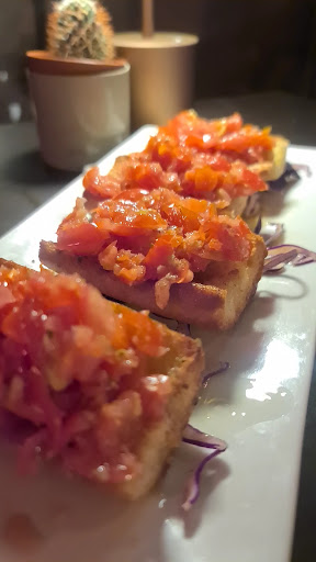 Read moreArrivati in 8 in una sera fredda con pioggia ci fanno accomodare nel déhor in un tavolo davanti alla porta, che resta spesso aperta. Il posto è umido e il locale è vuoto. Faccio presente al cameriere che dal tetto bucato cade acqua i cui schizzi mi hanno completamente bagnato il giaccone, chiedo se è possibile trovare una soluzione. Dopo mezz'ora di disagio, sollecito di nuovo e mi dicono che non sanno ovviare il problema (bastava mettere un contenitore alto come un bicchiere a contenere la goccia). Così l'unica soluzione è aprire l'ombrello per pararmi dagli schizzi, manco fossi nella sala d'attesa della stazione. Dopo un'ora di pioggia inizia anche a piovermi direttamente addosso dalla stesso buco. A quel punto mi alzo, faccio presente, di nuovo, il problema e chiedo seccata di cambiare tavolo. Solo a quel punto ci fanno accomodare dentro, dopo aver preso 2 ore di pioggia, mentre il locale continuava ad essere vuoto. A fronte di questo trattamento gretto, il conto per una sangria e 5/6 tapas a testa (gli altri si sono divisi una bottiglia di vino e forse una persona ha preso 2 cocktail), i vestiti bagnati e mal di gola e raffreddore compresi, è di 30€ a testa. Se si vuole avere prezzi da bar di lusso bisognerebbe avere anche un'attenzione al cliente diversa. Altrimenti il dubbio è che si tiri solo a far cassa come il peggiore...