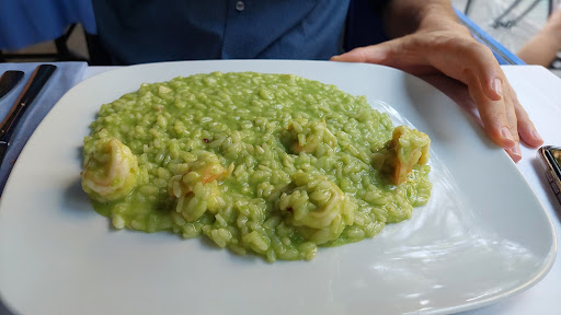 Si un buon posto per mangiare pesce abbiamo preso una frittura era molto buona Diciamo che i prezzi sono un po' in linea con quelli di Milano quindi alti per il resto anche un dehor coperto quindi ci sono un po' di posti il colore dell' arredamento molto bello bianco e blu stile Marittimo stile Grecia il tiramisù era molto buono fatto in casa se chiedete il caffè d'orzo però state attenti perché si potrebbero confondere con il caffè d'orzo e caffè perché lo fanno a mano senza la macchinetta Quindi teoricamente più buono però per chi fosse allergico al caffè normale come me deve prestare un po' più di attenzione. Il parcheggio difficile però non introvabile ed è in zona parcheggio residenti c'è un ingresso per sedia a rotelle non ho visitato il bagno. La richiesta anche fuori dal menù sono comunque ben accettate il cameriere consiglia. Due fritti misto un risotto con spada due caffè un tiramisù un'acqua naturale un calice di vino e due coperti €54 per Milano non è tanto per la...