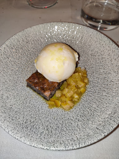 Read moreIl locale merita di sicuro di piu d'estate per via dei tavolini che si affacciano sull'orto che è la caratteristica predominante del locale e che influisce su tutto il menu. Io ho potuto godere del complesso che mi ha allietato la cena con musiche pop. L'arredamento è rustical chic con ampio uso del legno, sedie a dire il vero non molto comode e un'aria piacevolmente campestre che primeggia in tutto, belli i menu incorniciati come un quadretto. Veniamo proprio al menu dove ovviamente primeggiano le verdure ma non è assolutamente un ristorante vegetariano. Io ho scelto la degustazione di 6 portate (costo 40 euro + 22 per l'abbinamento vini che consiglio considerata l'ottima cantina). Le portate le sceglie lo chef quindi non vi è dato sapere cosa arriverà (bizzarramente la persona in sala mi ha chiesto che vino volessi ma non sapendo le portate è un po' difficile scegliere!). Giovane e disponibile il personale in sala (piu camerieri servono lo stesso tavolo) che ho trovato sempre competente su quanto presentato. Complessivamente i piatti sono molto piacevoli ed estremamente equilibrati nei sapori e consistenze, degni della fama della chef Alice Delcourt. Unica nota è l'impiattamento che non è particolarmente curato e a volte, complice forse l'immagine semplice del locale, sembra davvero approssimativo. Per chi si vuole rovinare la sorpresa ecco il dettaglio del menu degustazione, che comunque cambia con frequenza settimanale. Il pane che fanno fare esternamente è assolutamente formidabile, servito un po' più caldo sarebbe perfetto ma credo che che sia stata una svista del mio solo tavolo. Purtroppo un'unica varietà (farina integrale..petra?). Partiamo con la selezione: Insalata di verza con pompelmo fresco ricotta salata e ginepro. Pancia di maiale arrosto con cavolo rosso e crema di rafano: la salsa di rafano delicatissima mentre il maiale in alcuni punti ha conservato la sua stopposità. Zuppa di topinambur con panure alle erbe e aceto di ribes: ottimi gli equilibri delle consistenze. Risotto con crema di carote semi di girasole e coriandolo e chips di patate viola. Filetto d'anatra affumicato con sfoglia di patate. L'unico piatto che abbia trovato un po' eccessivo per l'elevata componente grassa non sufficientemnte bilanciata. Predessert sorbetto di kiwi: forse un po' anonimo visto il locale. Financier al pistacchio con timo pompelmo e...