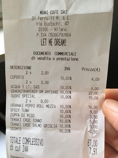 Touched base for dinner, smoggy table for two out in the patio which in the city of Milan most of the times is equal to eating on the street literally surrounded by cars getting parked next to your table. Therefore, forget the “zen vibes” and all the other nice touches you’d be expecting in a sushi restaurant.