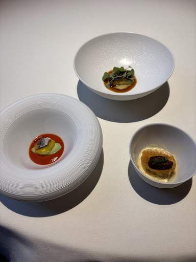 The amuse bouche was already setting up the expectations and the chef did not fail to meet them. Lobster was tender and fresh just the portion was so small it was so good😭 sourdough was warm and crunchy sticks were buttery and well salted. The signature risotto combined a lot of flavors: cheesy, herby, and a little tangy and fruity from the raspberry powder. Lovely touch so that it’s not overly cheesy and heavy. Foie gras and eel combo was perfection. Eel was tender with the sauce while foie gras was also tender with fattiness goes down so smoothly while still having the original flavour of each ingredient. I can taste them separately in my mouth but also together. Chicken breast was not super special just cooked well and kept the tenderness instead of being dry but that’s expected at a two star Michelin. The pasta was a little too al dente but the chef made it for it by giving the uni ice cream. Wow. Seafood flavours preserved with sweetness from sugar but also uni itself. The sea grapes also added a crunch to it. Palate cleaner was refreshing. Mille feuille is buttery and crispy although the first bite of the ice cream threw me off. The after taste is refreshing though. I think this is the best petit four I’ve ever had. No misses. Peach chocolate had real bits of peaches so aromatic. Milk chocolate had a good crunch. The pine nut cake had lemon drops on it. I like how the chef balances out sweetness/saltiness with tanginess super refreshing. Lastly the chocolate banana bite was so rich. The service is impeccable: I sneezed and a tissue box was...