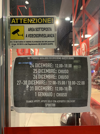 Dó una stella perché meno non si può dare !!! 😡😡 Arrivo alle 9.25 del 30 dicembre 2020, suono, non mi apre nessuno! Suono più volte: niente !! Dó una sbirciata dentro: il forno é chiuso 😳😳Ricontrollo l’orario di apertura: fino alle 22 come potete ben vedere dalla foto ! Incredulo ma pensando alla buona fede delle persone provo a telefonare (magari avevano un urgenza in toilette). Niente: non risponde nessuno ma intravedo dal vetro che qualcuno è dentro ! Dopo un trattamento del genere vi auguro di fallire !! Prosieguo: secondo me quando si è in torto palese ci si scusa comunque ! Ad ogni modo volevo precisare che il mio augurio, per quanto dettato dall'impotenza di una situazione che non avrebbe dovuto accadere, era solo verso il punto vendita, avendo dato per scontato che lo stesso fosse in franchising. Del resto non nascondo di essere un affezionato e soddisfattissimo cliente della pizza di Spontini (in particolare del punto vendita di via Cenisio dove la stessa sera del 30 dicembre, dopo l'amara delusione, sono andato a comprare una squisita teglia !!) Francamente non mi sarei mai aspettato un trattamento del genere da un punto diretto di vendita! Detto ciò, mi stupisce che un proprietario di un'azienda permetta ai gestori di un punto vendita diretto siffatti comportamenti verso la clientela ! Per concludere lunga vita commerciale ai punti vendita Spontini che, oltre ad una fantastica pizza, hanno rispetto per il cliente ! Le consiglio di leggere le recensioni non proprio rosee che su altri siti (per es. Tripadvisor) danno per lo stesso punto vendita di via Arona cosicché potrà fare le sue riflessioni e magari...