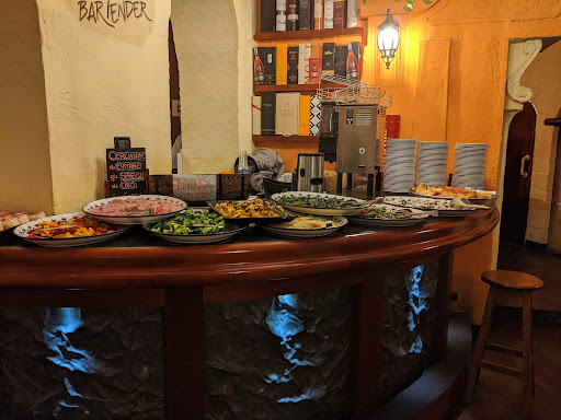 I have got mixed feelings about this place. The place, like some others, offers happy hour every evening for about 12/13 euros per person. Staff have been happy to explain it to me. You will get a drink from the list and bottomless food from the plates inside. What surprised me is finding warm food and staff continuously brought out a lot of new choices, including mains like pastas. If you want a second drink you just pay it from the price list (about 8 euros). Only downside, I regretted sitting outside as we have been tormented from flies, I know in such a warm weather is out of anybody control but I really can not bear them sitting on...