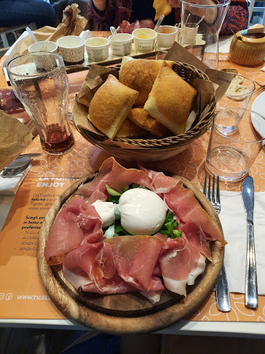 Read moreIl punto della ristorazione non è il solo cibo, dovrebbe essere innanzitutto il far star bene le persone. E per far ciò è necessario costruire un'offerta innanzitutto onesta come non hanno fatto i gestori del posto (o del franchise?). Sedendoci ci viene spiegato dalla cameriera che col coperto di 3.80€ è incluso l'all you can eat di tigelle e gnocco fritto. A casa mia, questa cosa significa che per quella cifra puoi fare almeno un paio di ricarichi senza pagare di più. Ci viene poi spiegato che ordinare almeno il tagliere è d'obbligo: va bene. Io ordino un tagliere vegetariano, mi viene portato un piattone con qualche misera zucchina e fette di melanzana grigliate, pomodorini e formaggi 2 olive e 2 cipolline in salamoia. Tutto molto casalingo, presentato non particolarmente bene, forse già sovrapprezzo. Un ensemble di salse viene poggiato sul tavolo in accompagnamento: discrete, ma servite in bicchierini di carta tipo macchinetta del caffè. I taglieri di affettati sembrano meglio, ma non li ho assaggiati. Il titolare ha poi insistito che due persone fra noi, che avevano già mangiato, ordinassero almeno da bere: atteggiamento che francamente è ormai anacronistico nella ristorazione, ed è sempre stato di cattivo gusto. Il locale era semivuoto, era tardi e c'eravamo solo noi praticamente: non credo che pretendere da chi si sieda di consumare per la sola occupazione della sedia sia ascrivibile al rispetto della professione, specialmente col locale semivuoto dove non si stava impedendo la consumazione ad altri avventori. Peraltro, faccio notare che le birre da supermercato offerte nel menù avevano dei ricarichi pazzeschi: 6 euro per una Peroncina da 33 cl è un furto, a fronte del fatto che altri locali riescono a offrirti per la stessa cifra quantomeno una IPA artigianale media. Ovviamente hanno pagato ANCHE i coperti. Questione coperto: avendo chiesto un altra porzione di tigelle e gnocco fritto, mi ritrovo a saldare DUE coperti, contrariamente a quanto spiegatomi poco prima -all you can eat un par di balle.