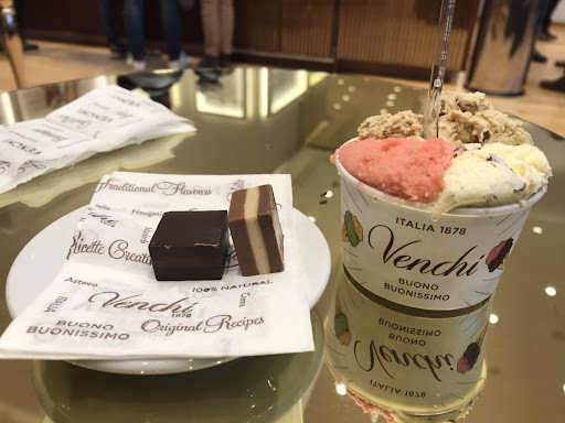 Venchi started few years ago selling good quality ice creams, but today the quality dropped dramatically and their products are just low level. Needless to say that the 9.76€ spent (4€ for each cup + 1.76€ for each chocolate) were the last ones I’ll ever give to this company.