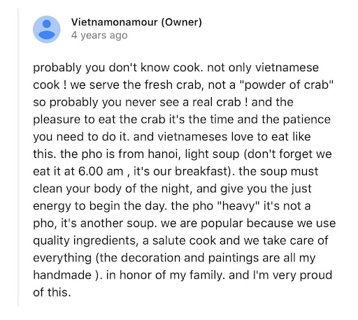 I’ve just been reading the way the owner responds to Vietnamese people who give them bad reviews (and they're all bad). The owner, sadly, is quite disrespectful, usually questioning whether the reviewer is actually Vietnamese. It’s not good business to argue with every bad review, and it's not kind to undermine or compete with someone's national identity.