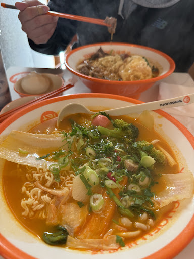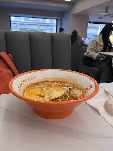 We don’t eat non halal meat, and we were scared there wouldn’t be almost any fish options to add to our noddles, but we got surprised with the quantity of fish options they had. The food was amazing, really really tasty!! Opposite from some comments I saw about the staff, I really felt kindness from them, even the curiosity they had about why we couldn’t eat meat! The space is actually pretty big, comparing with the restaurants in that area, there is a lot of space for you to enjoy your food. I would recommend for you to just make one bowl with your partner or friend , instead of one per each , because really makes you full.