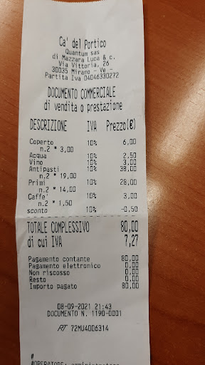 Arrivo al ristorante un mercoledì sera senza aver prenotato (siamo in due). Accolto con cordialità vengo fatto accomodare fuori (dentro non si può x motivi misteriosi visto che non c'era nessuno e i tavoli sono rimasti vuoti x tutta la durata della cena). Il presunto proprietario e chef ci decanta le proposte del giorno (non uno straccio di menù con tanto di prezzi). Ordiniamo antipasto di pesce cotto misto e un primo piatto. Per il secondo ci riserviamo la scelta poi. I fatti nudi e crudi. Materie prime, preparazione e presentazione ottimi. Il problema sono le quantità e i prezzi. Non puoi far pagare 19 euro un piatto con 5 assaggini di pesce e un primo che con due forchettate fai sparire dal piatto 14 euro. Il vino perché mai solo al calice o in bottiglia? Forse che una caraffa da mezzo litro di onesto prosecco sia troppo volgare x cotanto ristorante? Vista la mal parata e capito il nostro errore nell'aver scelto questo locale ,finiti gli spaghetti, siamo passati al caffè e poi al conto (senza nessuna protesta che tanto che protesti a fare se il taglio del locale è quello, lo chef forse pensa di avere una costellazione di stelle Michelin al petto e come tale vuole essere retribuito). In conclusione se volete ASSAGGIARE del buon pesce facendovi spennare venite pure a Ca' del Portico, diversamente statene lontani in giro c'è molto molto molto di meglio come rapporto...