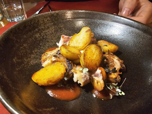 Read moreUn locale piccolo con una bella atmosfera. Noi abbiamo prenotato per due persone per le 20.30, al nostro arrivo non c’era tantissima gente. All’entrata sulla sinistra abbiamo i tavoli dedicati a coloro che fanno aperitivo mentre per mangiare ci sono i tavoli sulla destra. Il menù è molto semplice, comprende 4 antipasti, 4 primi, 4 secondi e 3 dolci. Come prima portata abbiamo preso l’insalata da piovra grigliata e i rigatoni al ragù di corte, e a seguire la guancia di manzo e il trancio di baccalà islandese. La pasta era molto buona, cottura perfettamente al dente e la salsa al wasabi dava quel tocco in più. La piovra grigliata era tenera ma la salsa acidula in accompagnamento non mi è piaciuta tanto. I secondi invece non sono granché, soprattutto l’impiattamento che lasciava un po’ a desiderare. La guancia di manzo era un po’ secca, sarebbe stato più buono se ci fosse stato un po’ più di fondo bruno ad accompagnarlo, invece il purè di patate con il tartufo molto buono. Il trancio di baccalà di per sé era molto tenero e saporito ma la spuma di salsa verde non è stato di nostro gradimento. Per finire abbiamo preso un dolce, il brownie al cioccolato con crema al caramello salato, arachidi e gelato alla vaniglia. Il dessert si presenta molto bene ed era anche buono. All’inizio mi aspettavo il brownie almeno un po’ tiepido, invece è servito freddo. Nonostante ciò era comunque molto buono, non troppo dolce. Il personale è molto professionale, gentile e competente. Per concludere vorrei dire che i piatti in generale sono buoni, solo un po’ più accortezza nei secondi, poiché anche l’occhio vuole...