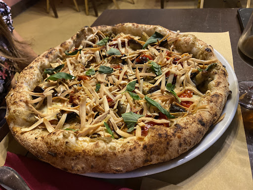 Ho conosciuto questo locale in occasione del Carnevale di Misterbianco del 2019; ne conservavo un buon ricordo e decido di ritornarci domenica, in occasione della sfilata dei costumi del 2022 (viene difficile chiamare “Carnevale” un evento che ha luogo in estate). Ho mangiato una buonissima e grande pizza che merita il certificato di eccellenza per il tipo di impasto utilizzato: il perfetto abbraccio tra il rustico impasto siciliano e il fragrante e morbido impasto napoletano. Lo consiglio già solo per questo! Ma come se non bastasse meritano di essere menzionati pure gli ingredienti che qua sono di qualità e utilizzati senza badare a spese. Nella pizza fuori menu “C’era una Norma” è stata utilizzata una buonissima crema di melenzane che insieme ai cubetti e alla ricotta grattugiata dà vita a qualcosa che vorreste non finisse mai perché è buonissima. Buona anche la pizza “Chidda cca sasizza” (che ci ha portato a fare qualche ironica battuta con la gentile cameriera); sarebbe stato il massimo se qua in sostituzione della cicoria utilizzata si fosse puntato per i friarielli saltati in padella ma questi sono solo gusti personali. Simpatico il campanello che da il benvenuto e bello il caloroso ambiente; servizio veloce e prezzi normali (e chiari nello scontrino fiscale). Tornerò sicuramente.