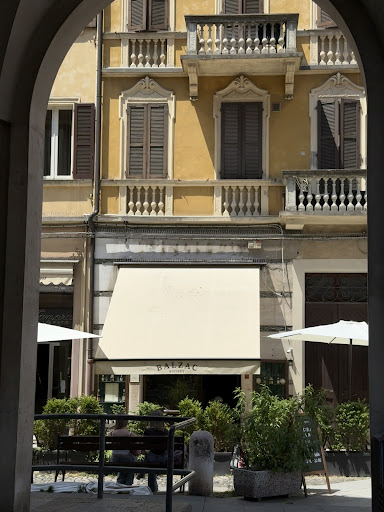 Italian food is amazing! But if you eventually get a little tired of tortellini, Parma ham, Parmesano Reggiano, or other pastas, hams, salamis and cheeses, then Balzac Bistrot is a delicious alternative. My wife and I stopped by, just to get a cappuccino. It was outstanding. So the next day, we returned. The view from the outdoor cafe onto the piazza is beautiful. But we chose to eat upstairs, where it was warm and cozy. A great soundtrack added to the homey atmosphere. More important, however, was the food -- classic French bistro fare. We enjoyed the foie gras, gazpacho, and salade nicoise, plus some chocolate lava dessert. Everything was really quite a bit better than we expected -- and the friendly service from the staff made for a memorable, enjoyable lunch.