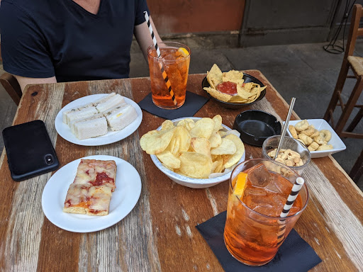 They don’t have a menu (like other bars). You get your drinks with a lot of free snacks. Aperol Spritz 7 €, White vine 6 € (Chardonnay, 0,1 l).