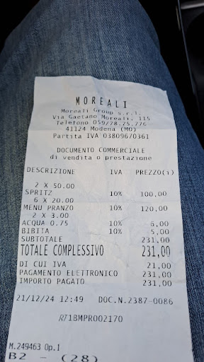 Read moreLo scontrino direi parli chiaro. Per un aperitivo per 10 persone di cui 3 non bevevano alcolici abbiamo speso 230€. È avanzato gran parte dello Spritz ordinato perchè non ci è stato detto che le caraffe erano per un numero di persone superiore ai presenti al tavolo. In totale è stato bevuto uno spritz a testa per 7 persone, in 3 hanno bevuto acqua minerale e sono stati postati 6 cestini di gnocchini fritti con salume. La scorrettezza di un conto fatto in maniera casuale si rifletterà in una perdita di clienti storici che frequentano da anni il locale....