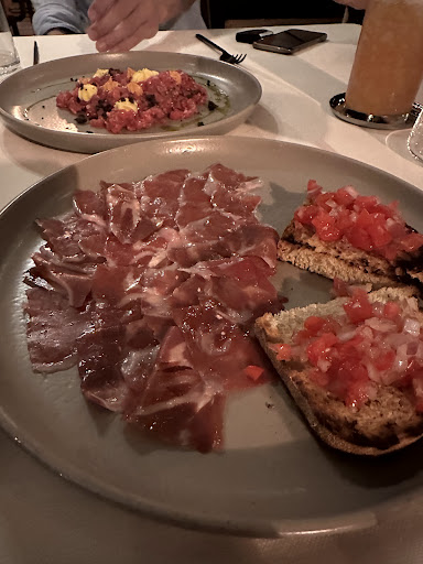 Siamo venuti a cenare in questo locale di sabato sera. La sala dove eravamo era vuota o quasi quindi si presuppone che il personale di sala fosse libero e disponibile per aiutarci e guidarci al meglio nell’esperienza. Ci hanno fatto accomodare in un tavolo da 4 persone circa, un tavolo molto piccolo, nonostante fossimo in 7. Abbiamo chiesto di aggiungere un altro tavolo per evitare di mangiare “spalla contro spalla”. Il servizio in generale è stato abbastanza distratto. Abbiamo chiesto acqua naturale e frizzante, che non ci è stata portata finché non abbiamo sollecitato in quanto avevamo addirittura finito il pane compreso nel coperto. Al momento dell’ordinazione, il ragazzo ci ha assicurato che le loro carni sarebbero arrivate al sangue perché è loro consuetudine e specialità servire la carne con questa modalità di cottura (TENETE BENE A MENTE). Arrivano gli antipasti e rimaniamo tutti soddisfatti: tartare fumè e tartare rare erano molto buone, altrettanto buone erano le empanadas e le crocchette. Quando ci viene servita la portata principale rimaniamo tutti un po’ delusi: porzioni molto scarne, al di sotto dei 200gr di carne. In particolar modo la Picanha era davvero misera, sicuramente non abbastanza per saziare un adulto medio. Diciamo che per un ristorante specializzato nella carne, ci aspettavamo qualcos’altro. Aggiungo inoltre, che le altre tagliate NON ERANO AL SANGUE!!! Erano tutte di media cottura, tendenti al ben cotto. Una tagliata è stata mandata indietro in quanto troppo cotta. Il ragazzo che ci ha guidati nell’ordinazione ci aveva dato altre indicazioni. Di cattivo gusto la risposta del ragazzo che alla richiesta di avere la tagliata davvero al sangue: ha detto “questa non te la posso fare al sangue, te ne devo portare una nuova”. Di certo non siamo una banda di tonti… lo sappiamo che non si può tornare indietro nel tempo!!! Al momento del conto uno dei ragazzi ci ha consegnato lo scontrino e si è offerto di venire al tavolo per incassare senza farci alzare. Nonostante ciò è stato tutto molto confuso: avevamo capito 40 e invece era 50 euro a testa. Ha fatto confusione anche con i pagamenti con carta di credito. Sicuramente non torneremo. Eravamo in pochi per creare confusione e il locale non era proprio pieno. Siamo usciti con la fame e spennati!...