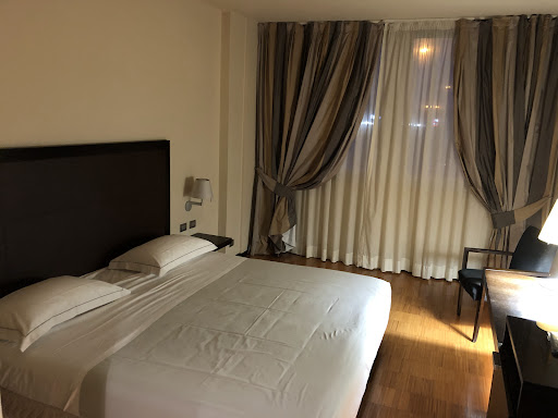 Read moreCome mi piace fare spesso, al fine di compilare una recensione che sia la più precisa e puntuale possibile, anche questa volta mi accingo a dare un voto per ogni singola cosa notata e poi alla fine si tireranno le somme (ed il voto medio). Vado ad incominciare... |10 alla posizione (vicinissimo all'uscita dell'autostrada, ma nonostante ciò abbastanza silenzioso e non appestato da gas di scarico);|10 al parcheggio (grande, comodo e gratuito);|8 alla Reception (media tra il 4 della sgradita sorpresa dell'aver previsto inizialmente la mia camera nella dependance, il 10 della gentilezza, dopo le mie rimostranze, nel trovarmi una stanza nel corpo centrale dell'hotel ed il 10 in generale, per i rapporti avuti durante il soggiorno, compreso l'averci permesso un piccolo "late check-out");|10 al letto della camera (immenso quasi al punto da necessitare di google maps per trovare la posizione precisa di tutti gli occupanti);|9 al bagno (buona metratura ed ottima la fornitura di prodotti);|9 alla camera (non immensa, ma ampiamente sufficiente e corredata di simpatico terrazzino, seppur vuoto) |4 ai servizi presenti (nel giudizio pesano parecchio il telefono muto e l'illuminazione scarsa: peraltro la lampada sul tavolo, quella su cui facevamo il maggior affidamento per vederci, ogni tanto si "staccava" ed occorreva aprire il pannello dei salvavita e riattaccare il collegamento, come insegnatoci dalla cameriera);|3 all'insonorizzazione (in realtà il problema non era nemmeno tanto quello del rumore proveniente da altre parti, ma il fatto che la parete su cui poggiava la testata del nostro letto non era di mattoni, ma di cartongesso(?), per cui insomma quando dall'altra parte si appoggiavano alla loro testata, di qua si sobbalzava);|9 alla palestra (non immensa, ma adeguatissima a far trascorrere un po' di tempo in maniera simpatica);|8 alla SPA: (poche cose, tra cui una doccia in cui non funzionava il pulsante del getto idromassaggio. Non è un gioiello eccezionale, ma è comunque una cosa veramente piacevole di cui poter approfittare, peraltro senza sovrapprezzi di alcun genere. Suggerisco però di cambiare quanto riportato nel foglio in camera, nonchè in ascensore, dove si trovano orari di apertura inesatti);|10 alla colazione (essendo un 4*, offrire una buona colazione, com'è questa, dovrebbe essere pressochè normale. La particolarità di quest'albergo è però rappresentata dalla cameriera Domenica, che unisce una gentilezza da competizione europea ad una dolcezza ed una disponibilità corredate da un sorriso, sempre stampato sul viso, così solare da rasserenare anche le giornate più buie e piovose).|Fatti i conti, il voto medio è 9, che però rimane in attesa di omologazione, dato che mi sovviene or ora il fatto che, seppur indicato nella conferma di prenotazione ricevuta via mail, non ci è stato offerto il "Welcome drink" al nostro arrivo: vorrà dire che me lo aspetto doppio nel caso dovessi tornare in questo hotel in futuro. |In realtà devo dire onestamente che tutto ciò che può non essere stato assolutamente perfetto viene abbondantemente ammantato dall'eccezionale rapporto qualità/prezzo: io sarò stato anche fortunato a trovare un'offerta splendida, ma 50 euro al giorno, per una doppia, è un prezzo che fa diventare il telefono muto un oggetto di design, la lampada malconcia un simpatico antistress, gli orari sbagliati della SPA un divertente giochino matematico,...