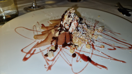ah, beh, stasera ho chiuso con la pera caramellata guarnita con ricotta al miele, crumble di mandorle, cioccolato e un ridotto di lambrusco... 'na goduria...