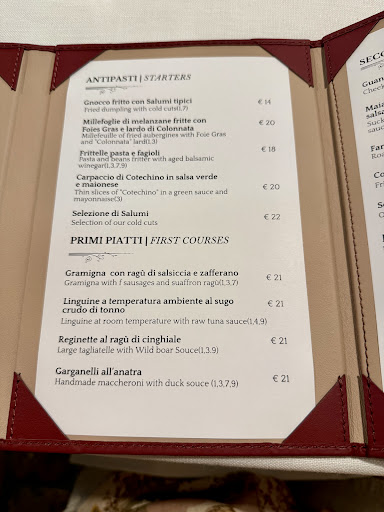 La cucina è la sintesi perfetta di profondissima tradizione (alcuni piatti hanno 600 anni) e modernità (temperature e cotture ineccepibili). Leggi il menù e pensi di alzarti così pieno da non respirare e invece la cura nell’equilibrio di grassezza, untuosità, acidità e freschezza è incredibile. A partire dal cotechino fritto con lo zabaione: sì, hai l’idea che sia l’ultimo piatto che mai ti concederanno le tue coronarie prima di darti il foglio di via e invece è rimarchevolmente leggero e sorprendentemente bilanciato. Liberi tutti sul resto del menù, dove scegliete cascate sempre bene, con forse solo una piccola nota sulle frittelle di minestrone che, per quanto affascinanti, non mi hanno fatto l’effetto wow del resto del pasto, ma che consiglio comunque per cultura per capire territorio e tradizione.