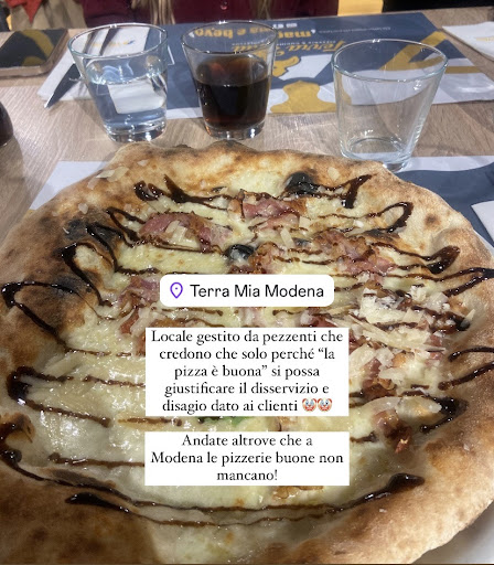 PRIMA ED ULTIMA VOLTA CHE MI RECO IN UN POSTACCIO SIMILE!! Ho cenato qui ieri sera con 7 amiche per la mia laurea nel primo turno. Attesa infinita non solo per le pizze (comprensibile, visto che c’era molta gente) ma pure per il bere?? Mezz’ora di attesa per un singolo calice di vino e alla sollecitazione, il cameriere risponde: “eh ci vuole tempo”. Dopo tanta attesa arrivano le pizze normali a tutte, avevamo due ragazze celiache al tavolo a cui la pizza è arrivata con la bellezza di 1 ora e 20 di ritardo, quando noi altre avevamo già finito di mangiare. Ma non solo: a una delle due hanno fatto arrivare la pizza sbagliata!! Nonostante ciò decidiamo pure di prendere dei dolci, ormai che eravamo rimaste sedute fino al ben oltre il secondo turno in attesa delle pizze, e a locale ormai non più trafficato, ci mettono comunque tantissimo tempo a portarli, dicendoci dopo 20 minuti dall’ordine che non era disponibile uno dei dolci ordinati. Poi dopo un po’ di tempo, un’altro cameriere invece ci dice che il dolce c’è e lo porta. Bah decidetevi! Ci alziamo che ormai eravamo veramente nervose, andiamo a pagare sperando che almeno ci facciano uno sconto anche piccolino sul conto finale, visto i grossi disagi che ci hanno provocato tutta la sera. E facendo notare il disservizio anche in cassa, ci viene detto che hanno avuto problemi con il forno (dopo che tutta la sera hanno fatto finta di nulla, dicendoci di star tranquille che la pizza è già in forno e stava arrivando) e davanti a tutto ciò l’unico commento uscito dalla bocca della cassiera è stato: “beh almeno la pizza era buona no?” Ma ci prendi in giro?! Oltre a non averci offerto nessun tipo di sconto dopo tutto ciò che ci hanno fatto passare, dividiamo il conto in parti uguali e viene 23,06€ a testa e manco la simbolica cortesia di arrotondare quei 6 miseri centesimi sti pezzenti sono riusciti a fare! Ah e in aggiunta per concludere, una mia amica ha chiesto un babà a parte da asporto da portare alla figlia che loro non solo hanno distrattamente spalmato sul conto comune di tutte noi, ma gli hanno anche fatto pagare in aggiunta solo sulla sua parte un euro in più per un po’ di crema sopra. Siete vergognosi! Ci sono molti altri posti che fanno la pizza buona uguale anche senza glutine dove almeno se sbagliano cercano di rimediare il disagio causato al cliente. Unica cameriera davvero seria e gentile è stata la ragazza giovane, che notando il nostro malcontento ci ha dato una mano e cercato di rimediare l’ormai irrimediabile. Ma del resto un disservizio imbarazzante che non vale manco 6 centesimi, evitate questo “locale” (sempre se così lo si può definire) gestito da...