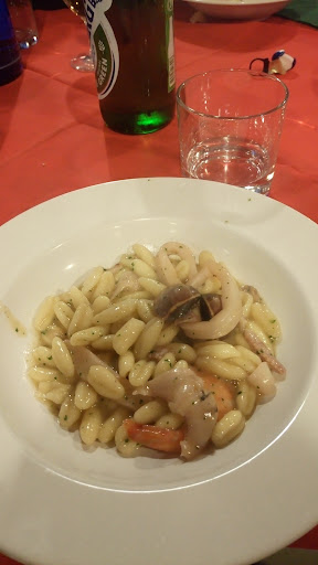 Read moreCapitati forse in una serata no.. Il proprietario in tuta, ci fa accomodare e ci elenca a voce i tre primi e i tre secondi disponibili per cena. Avendo letto "Risto/pizza" chiedo se fosse possibile mangiare una pizza ma ci viene detto che non le facevano. Allora io scelgo gli spaghetti aglio olio e peperoncino e una scaloppina al vino. Arrivano gli spaghetti dopo una ventina di minuti, talmente sciapi e insapore che ho dovuto aggiungere sale e peperoncino al piatto. Dopo più di mezz'ora mi servono la scaloppina, cotta male e annegata in una salsa acida... Pagato (a sorpresa perché ovviamente nessuno ci ha illustrato i prezzi di quello che ordinavamo) con una bottiglia d'acqua...