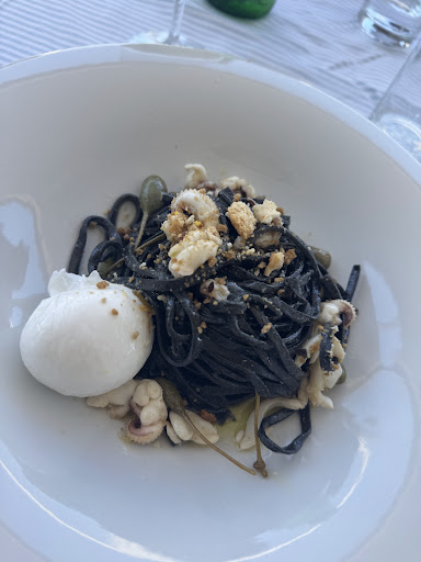 I primi: • Tagliolini al nero di seppia con burrata, seppioline, tarallo e capperi: piatto troppo unto, burrata freddissima da frigo, capperi duri. Sapore sbilanciato. • Tortelli “dei 4 colori” con ripieni diversi: belli da vedere, ma pasta asciutta, ripieni indistinguibili, gusto piatto. Sembravano precotti. • Ravioloni ricotta e spinaci con rucola e cacioricotta: piatto tiepido, non armonico. Non lo abbiamo finito.