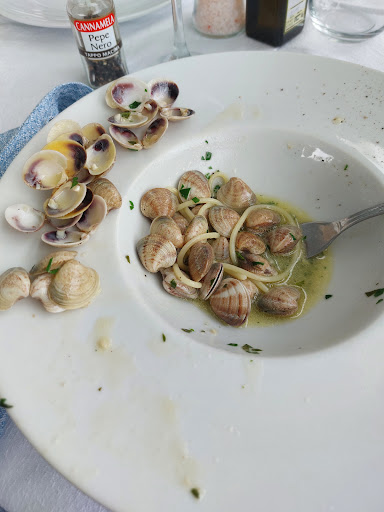 Read moreIntanto chi parla di location sul mare è evidente che non ha mai visto una LOCATION SUL MARE VERA! Detto questo arriviamo in questo posto fatiscente e sporco,sotto i tavoli c'era di tutto ed eravamo l'unico tavolo e nel frattempo a 3 metri dal nostro tavolo il proprietario si dedicava alla pesca con la canna. nel porto, vabbe, poco male, ordiniamo! Chiediamo l'astice ( premetto che è nostra abitudine mangiarla e come qualunque posto al mondo ti aspetti o un acquario oppure che ti venga portata al tavolo per garantirti la freschezza del prodotto, ma la risposta è stata: le ho comprate ieri vive e le ho abbattute... ovviamente abbiamo desistito, iniziamo con gli antipasti, 10 ricci e crudo mare per 2, ancora ocozze gratinate e una tartare di tonno, com'era? Non era come doveva essere, il tonno era ossidato. I frutti di mare si sono rivelati cozze pelose, ostriche e stop! Io e mia moglie eravamo ospiti quindi abbiamo evitato di commentare ma il clou è stato quando chiedendo 4 spaghetti alle vongole, sono arrivati 4 spaghetti praticamente aglio e olio...con i lupini e non le vongole di cui buona parte completamente chiuse come potete costatare dalla foto!!! Ok ci guardiamo e decidiamo di andare via perché è stato tutto molto scadente. Al pagamento la fatidica frase: signori tutto bene? Li, ho fatto notare che le vongole non erano vongole...parte la supercazzola tra i proprietari esordendo che noi non eravamo esperti in materia ma come al solito la gente parla non sapendo che magari difronte ha qualcuno che si occupa di ristorazione da 27 anni come me. La supercazzola continua cercando fra le fatture per mostraci la voce vongole lupini ma nonostante cercavo di far comprendere che almeno ci avrebbero dovuto avvisare all'ordinazione che non si trattava di vongole a 14 euro al kg ma di lupini a 10 euro al kg la risposta è stata: eravate voi che dovevate chiedere se erano vongole o lupini. Detto questo non serve scrivere altro in queste righe e inutile dire che chi ci ha invitato si è scusato con noi... ps: gli spaghetti aglio olio e lupini li abbiamo pagati al costo...