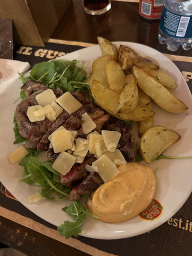 Read moreDomenica sera decidiamo in 4 di cenare presso questo locale. Ci accomodiamo e al momento dell’ordinazione la cameriera ci consegna delle carte da caricare su app per avere lo sconto di 5€ alla cassa. I piatti arrivano in diverse tranches, arriva il primo (una tagliata) e dopo 10 minuti arrivano altri 2 piatti (tagliata e costine). La quarta persona invece sembra che non debba mangiare, facciamo presente la cosa a 2 cameriere diverse ma comunque il piatto non arriva. Non potendo aspettare il piatto, in quanto trattandosi di carne andrebbe mangiata calda, iniziamo e finiamo il pasto senza che arrivi il piatto di petto di pollo … l’ultimo piatto arriva dopo ben 30/35 minuti rispetto alla seconda tranches. Passiamo così il resto del tempo ad aspettare che l’ultimo finisca. Al momento del pagamento di nuovo problemi, facciamo presente di aver ricevuto questi buoni da 5€ al cassiere che ci comunica di non poterli cumulare. Decidiamo allora di dividere i conti così da usufruirne e lo comunichiamo al cassiere. Quando ci rendiamo conto che sugli ultimi 2 scontrini i buoni vengono caricati ma sui 2 precedenti no chiediamo spiegazioni e quest’ultimo (sui primi 2 scontrini il cassiere, dopo nostra continua richiesta, conferma di averli caricati ma non è così) che invece di scusarsi ci accusa di non avergli dato i buoni nonostante fossimo stati tutto il tempo con il buono sul display e lo avessimo mostrato più volte. Nella cassa a fianco addirittura un collega aiutava a scaricare l’app per poter utilizzare gli sconti. Capisco che sbagliare è umano sopratutto sul lavoro, ma neanche scusarsi è maleducazione...