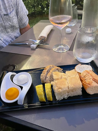 Una volta accomodati in uno dei tavoli esterni, ci viene proposto un piccolo assortimento di pani e focaccia, prodotti in casa e accompagnati da due cucchiai di mousse, una ai formaggi e l'altra alle carote, cipolle e spezie varie. Dopo aver preso visione del menù optiamo per due degustazioni complete di antipasti e cioè sei assaggi di freddi e quattro di caldi. Disposti in delle ciotoline ci hanno servito : insalata di seppia con crema ai piselli e verdurine croccanti; farro di Monterosso con tataki di salmone selvaggio ; sgombro scottato e marinato alle erbe aromatiche e cipolla di Castelleone; ceviche di orata marinata con lime e peperoncino; alici marinati agli agrumi e aceto; carpaccio di polpo. Come caldi : gamberone in pasta kataifi su maionese di soia; pepita di baccalà con ketchup di rape rosse; oliva tenera ascolana ripiena di pesce; trippa di rana pescatrice. A seguire un primo da dividere in due e cioè : tagliatelle, fatte a mano, con crostacei e tartufo nero estivo. Abbiamo chiuso il pasto con il bon bon di cioccolato bianco con cuore di distillato di frutti di bosco, che viene di prassi offerto come pre dessert , raccomandando di degustarlo a bocca chiusa, senza masticare , per deliziare il palato con " un'esplosione di sapori ", e due caffè. Da bere, oltre l'acqua, uno " Spumante Lacrima di Morro d'Alba Rosè Metodo Martinotti " dell'Azienda Marotti Campi.