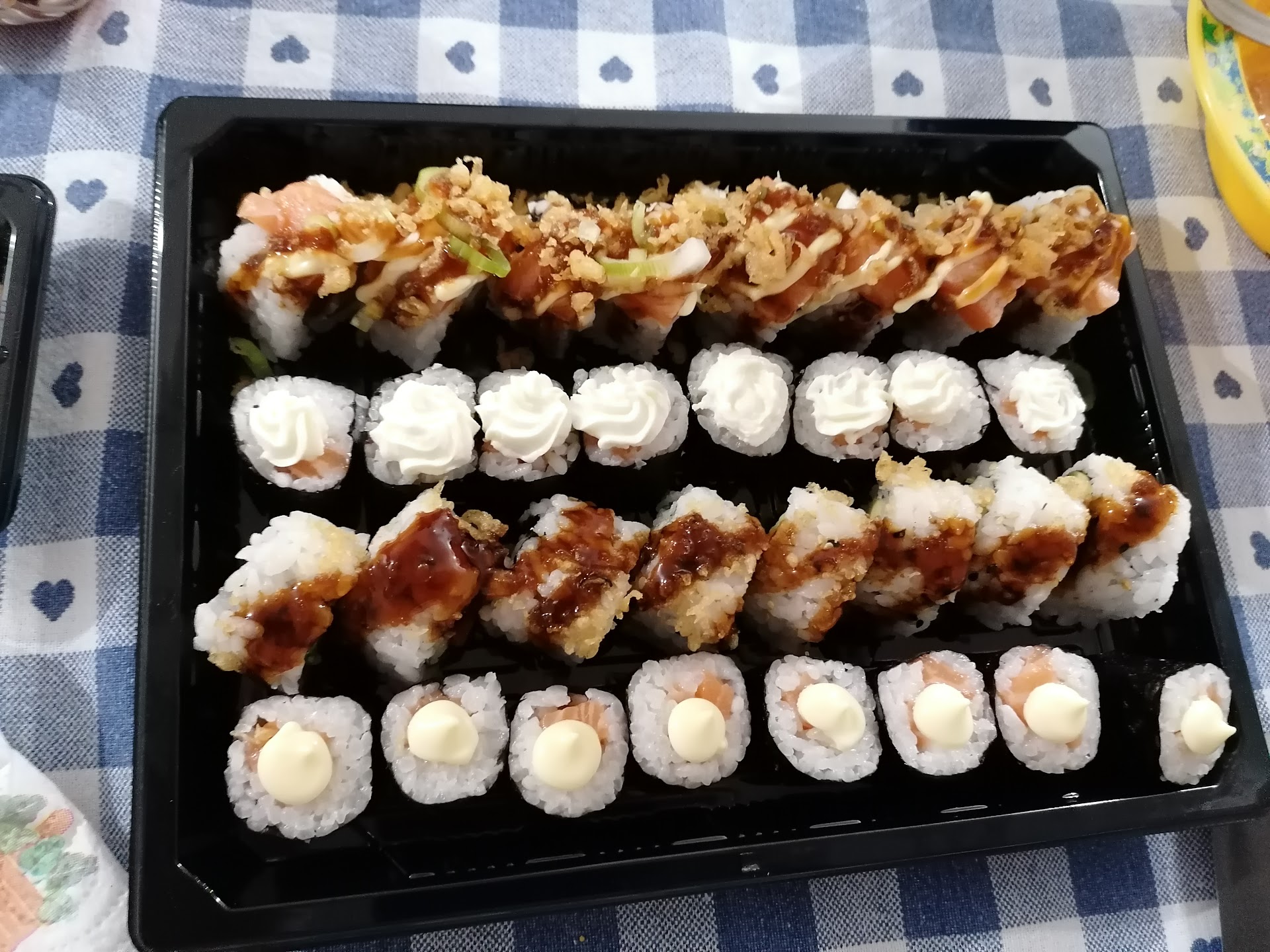 Read morePer ora abbiamo sempre sfruttato il take away. Il pesce é fresco, di qualità, le porzioni abbondanti, curate e davvero buone. Un po'meno i ravioli: pasta dura e poco saporiti, diciamo che sono migliorabili. Il prezzo non é economico, per quello che vedete in foto cioé il "sushi party special" (32 pezzi tra hosomaki e uramaki e 20 nigiri misti) più più una porzione di ravioli ai gamberi abbiamo speso 60€,ma considerata la materia prima li consideriamo ben spesi, inoltre a termine pasto eravamo estremamente sazi. I proprietari sono simpatici e alla mano, nonché cortesi. Ci torneremo. Nelle foto ci sono gli stessi piatti confezionati e non.