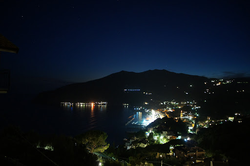 Noi siamo arrivati verso il tramonto ed abbiamo potuto godere dei diversi giochi di luce che si susseguivano dal tramonto all'imbrunire tra l'interno della sala ed il panorama esterno; il cielo poco alla volta volgeva ad un blu intenso e la luce ambrata sopra al tavolo poco alla volta creava un alone che ha dato un tocco di calore alla serata mentre sullo sfondo si vedevano le luci del litorale di Moneglia.
