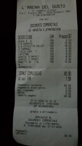 Read moreIn data 07/01/2020 siamo andati la mia famiglia e la famiglia di un mio amico a mangiarci una pizza per un totale di sette persone. Locale carino e ben arredato ma non tanto grande. Ci hanno fatto accomodare in un tavolo che si trovava in fondo aĺla sala. Ci hanno portato delle olive per stuzziccare. Abbiamo ordinato cinque pizze, due cotolette, una bottiglia di acqua e una caraffa di birra. La pizza era buona non bruciacchiata e dello giusto spessore. Il servizio era buono però dopo aver ordinato e portato le pizze ed altro si sono dimenticati di noi difatti per ordinare una seconda bottiglia di acqua non riuscivamo a dirlo ai camerieri che purtroppo dalle parti del nostro tavolo non si affacciavano mai e quindi è dovuto andare il mio amico dal cameriere per dirgli di portarci un altra bottiglia di acqua. Anche quando abbiamo terminato di mangiare cercavamo il cameriere per farci portare il conto ma niente ed allora siamo andati direttamente noi alla cassa. Nota molto dolente i prezzi che non erano per niente bassi ma abbastanza alti. Le pizze costavano tutte oltre la norma. Si allega foto scontrino. Conclusioni: tutto buono ma dove arriveremo con questi...