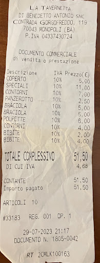 Read moreSCONSIGLIATISSIMO!!! Ci sono locali che non meriterebbero neppure di esser chiamati “luoghi di ristoro”: trattorie, pizzerie o ristoranti che dir si voglia…e questo è uno di quelli! Prezzi spropositati soprattutto se rapportati alla qualità (delle pochissime pietanze in menù) pressoché inesistente: non si può rovinare così la cucina pugliese, propinando braciole stoppose ed insipide cucinate in salsa acida proveniente da un Discount di qualità pessima, polpette anch’esse cotte in pomodori aciduli, salumi e caciotta dozzinali… Siamo in Puglia! La salsa di pomodoro, quella VERA, dovrebbe essere il nostro fiore all’occhiello! Chiudete per favore, non continuate a rovinare la cucina pugliese e a derubare i poveri e ignari clienti! P.S. Abbiamo cenato in 2 per 25 euro a cranio (5 euro di coperto per cenare nei piatti di plastica)....