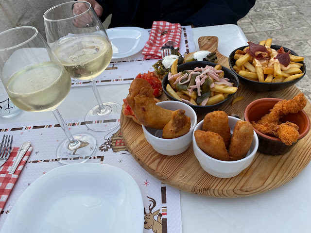 Dopo una lunga attesa, una donna, probabilmente, dato l'abbigliamento, la stessa che aveva fritto, arriva al tavolo. Gli antipasti (snack fritti), sono stati serviti già tiepidi, senza le salse o le spezie scelte e scritte sul menù. Tutto troppo oleoso, patatine non ben cotte e senza sale. Il tutto viene presentato in dei piatti fondi o in delle ciotole, senza alcun decoro o collegamento rispetto allo stile del locale o della Puglia.