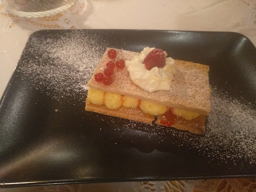 Menù interessante, percorre la tradizione della zona e qualche piatto di pesce che potrebbe essere più ricercato per non cadere nel “già visto”. Sformato di zucca con fonduta di parmigiano e cotechino di ottimo livello. Tre risotti in carta, scelto quelli alle rape rosse e gorgonzola, arrivato dopo un’attesa lunga ma adeguata per un piatto espresso. Ci eravamo raccomandati sulla cottura che fosse adeguata, peccato che una volta arrivato fosse oltre una accettabile cottura, sapore però molto buono ma non si poteva mangiare. Proseguito con costolette di maialino ottime e stracotto di cappello del prete con polente ottimo, anche se un poco asciutto. Dolci con assaggi di rum e cioccolato, idea con grandissime potenzialità ma servito un po’ troppo alla buona, cioccolata interessante senza spiegazioni se non la percentuale, tre rum di medio profilo e 6 cioccolati. Se ci fossero 3 rum di alto profilo e al massimo 3 cioccolati, senza il foglio di carta attuale che non dice nulla del cioccolato, aggiungendo anche 2-3 euro al piatto, gli intenditori apprezzerebbero. Mentre fantasia di cioccolato, buono il soufflé e ottima la fetta di tortina morbida, gelato senza infamia e senza lode, fetta di pistacchio inutile, migliorando il gelato e la presentazione è un piatto notevole per chiudere il pasto.