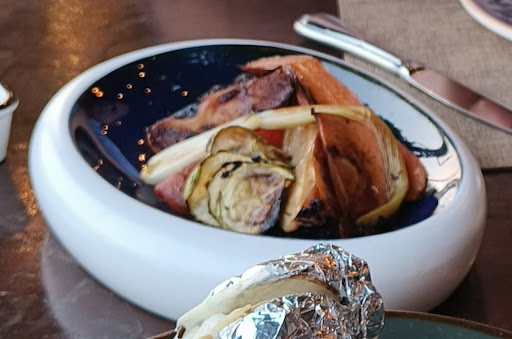 Read moreCena in due. Un filetto alla griglia e un sotto filetto. Fine delle cose positive. La carne era contornata da mezza patata al cartoccio che avrebbe dovuto essere guarnita da una salsa al gorgonzola, insapore. Abbiamo chiesto un contorno di verdure miste grigliate, (al massimo 150 grammi) OTTO EURI!!!! Visto che non eravamo sazi, abbiamo anche ordinato i Tacos, che altro non sono che micro-piadine del diametro di 5 centimetri con carne e verdura, costo TREDICI EURI a testa. Due calicidi vino, una bottiglia d'acqua e un caffè hanno portato il conto a CENTO EURI! Location deludente. Visto il luogo e la stagione avremmo gradito che le spirali antizanzara fossero state messe per tempo e non solo dopo che metà dei commensali si è portata in strada per spruzzarsi i repellenti. La mensa sotto il pergolato, bella da vedere ma permetteva la caduta di foglie ed insetti direttamente nei piatti. Per il prezzo corrisposto non avrebbe guastato una tovaglia sul tavolo. Scrivo a caldo perché non ho trovato la millantata qualità. Siamo tornati a casa...