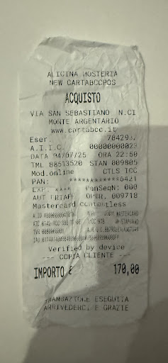 Non neghiamo che lo abbiamo mangiato x la spaventosa fame (oramai erano le 22.15 di sera). Da notare che ci è stato chiesto di arrivare alle 21 precise per non intaccare il sevizio. (Cosa che poi si rivelerà appunto pessima). Non appena tolto il piatto arriva il pesce già cotto (ma non si fa vedere prima il Pesce di cuocerlo???!!) Pesce buono x carità, ma senza averlo visto, senza scontrino del peso e senza nemmeno una scusa da parte del responsabile / titolare. Quindi, tolti i piatti del primo, subito il secondo è tantisaluti. Caffè e conto. Mi dirigo dentro e chiedo per l'ennesima volta di parlare con un responsabile. Niente, mandano solo ragazzi inesperti e stranieri a parlare. Non si presenta nessuno per una scusa, una parola... niente. Totale conto 190 euro!!!!!!!!!