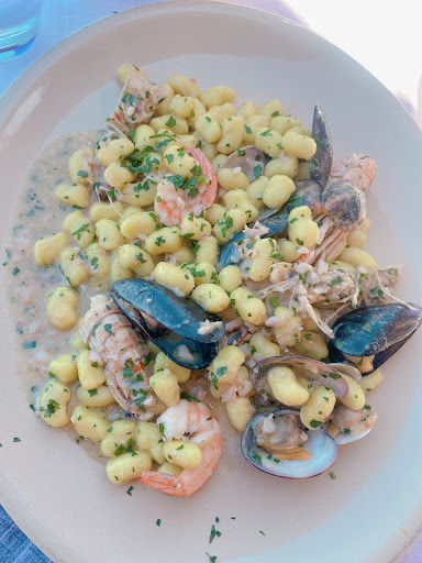 Read moreInvogliati dalle buone recensioni abbiamo prenotato in questo ristorante...la location è carina con vista sul mare, per il resto siamo rimasti un po' delusi. Dal menù e dai prezzi ci aspettavamo molto di più. L'antipasto del giorno non era male ma per 20 euro ci saremmo aspettati un po' di più sia qualitativamente che quantitativamente. Gli gnocchetti agli scampi buoni ma niente di speciale. Dulcis in fundo il fritto misto di pesce una completa delusione, i calamari avevano una consistenza di gomma il resto non aveva un gran sapore di mare. Abbiamo mangiato in 2 con 3 portate e un contorno e mezzo litro di vino il tutto a 70 euro...ci è sembrato un tantino eccessivo. Il personale gentile ma pur di risultare 'simpatico' a tratti diventa un po' invadente. Di sicuro non ci ritorneremo.